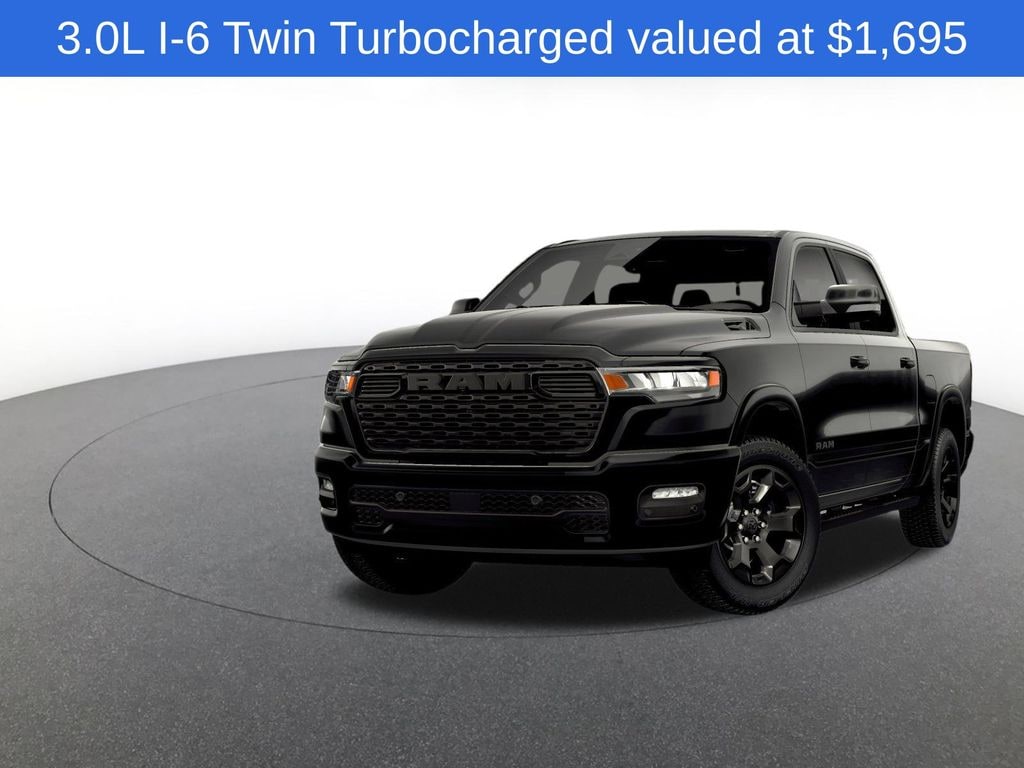 Big Horn Level 2 Equipment Group (115V Auxiliary Power Outlet, 115V Auxiliary Rear Power Outlet, 12" Touchscreen Display, 2nd Row In Floor Storage Bins, 3 Rear Seat Head Restraints, 4 Way Front Headrests, 400W Inverter, 4G LTE Wi-Fi Hot Spot, 9 Amplified Speakers w/Subwoofer, Air Conditioning ATC w/Dual Zone Control, Apple CarPlay, Auto Power-Folding Mirrors, Auto-Dimming Exterior Driver Mirror, Auto-Dimming Rear-View Mirror, Black Exterior Mirrors, Black Premium Power Mirrors, Body Color Fender Flares, Bucket Seats, Center Console Parts Module, Cluster 7.0" TFT Color Display, Configurable Drive Mode, Connected Travel & Traffic Services, Connectivity - US/Canada, Convex Wide-Angle Exterior Mirror Insert, Deluxe Cloth Bucket Seats, Disassociated Touchscreen Display, Exterior Mirrors Courtesy Lamps, Exterior Mirrors w/Heating Element, Exterior Mirrors w/Supplemental Signals, Front Seat Back Map Pockets, Full Length Floor Console, Global Telematics Box Module (TBM), Glove Box Lamp, Google Android Auto, GPS Antenna Input, GPS Navigation, HD Radio, Heated Front Seats, Heated Steering Wheel, Integrated Center Stack Radio, Integrated Voice Command w/Bluetooth, Leather Wrapped Steering Wheel, LED Dome Lamp w/On/Off Switch, LED Footwell Lighting, Manual Adjust 4-Way Front Passenger Seat, Media Hub w/2 Charge Only USBs, Overhead LED Lamps, Power 2-Way Driver Lumbar Adjust, Power Adjust 8-Way Driver Seat, Power Adjustable Pedals, Premium Overhead Console, Radio: Uconnect 5 Nav w/12.0" Display, Rear 60/40 Folding Seat, Rear Center Armrest, Rear Power Sliding Window, Rear Window Defroster, Remote Tailgate Release, Security Alarm, SiriusXM Radio Service, SiriusXM w/360L, Steering Wheel Mounted Audio Controls, Sun Visors w/Illuminated Vanity Mirrors, Universal Garage Door Opener, USB Host Flip, and Wheels: 20" x 9" Aluminum Chrome Clad (WRK)), Night Edition (Accent Color Door Handles, Accent Color Premium Power Mirrors, Accent Color Tailgate Handle, Anti-Spin Differential Rear Axle, Black Exterior Truck Badging, Black Headlamp Bezels, Black Interior Accents, Black Painted Exterior Mirrors Caps, Black Tail Lamp Bezels, Body Color Front Bumper, Body Color Rear Bumper w/Step Pads, Dual Exhaust w/Black Tips, Grille Black Surround Black Mesh, RAM Grille Badge - Black, and Wheels: 20" x 9.0" Aluminum Painted Clad), Quick Order Package 21Z Big Horn, 4-Wheel Disc Brakes, 48V Belt Starter Generator, 6 Speakers, ABS brakes, Air Conditioning, Alloy wheels, AM/FM radio, Apple CarPlay/Android Auto, Auto High-beam Headlights, Brake assist, Bumpers: chrome, Cloth Bucket Seats, Compass, Delay-off headlights, Driver door bin, Dual front impact airbags, Dual front side impact airbags, Electronic Stability Control, Front anti-roll bar, Front Bucket Seats, Front Center Armrest w/Storage,