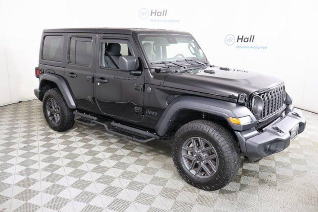 Clean CARFAX. Black Clearcoat 2024 Jeep Wrangler Sport S 4WD 8-Speed Automatic 3.6L V6 24V VVT Wrangler Sport S, 4D Sport Utility, 3.6L V6 24V VVT, 8-Speed Automatic, 4WD, Black Clearcoat, Black Cloth, We are currently offering Vehicle Purchase Home Delivery by appointment. Please contact for details., 2-Door Passive Entry, Front Door Locks, 240 Amp Alternator, 7 & 4 Pin Wiring Harness, Advanced Brake Assist, Air Conditioning w/Auto Temperature Control, Air Filtering, Automatic Headlamps, Auxiliary Switches, Class II Receiver Hitch, Cluster 7.0" TFT Color Display, Convenience Group, Corning Gorilla Glass, Deep Tint Sunscreen Windows, Emergency/Assistance Call, Enhanced Adaptive Cruise Control, Front 1-Touch Down Power Windows, Full Speed Forward Collision Warning Plus, Heated Front Seats, Heated Steering Wheel, Power Heated Mirrors, Premium Wrapped Steering Wheel, Quick Order Package 24S Sport S, Remote Keyless Entry, Remote Start System, Security Alarm, Speed Sensitive Power Locks, Sport S, Sun Visors w/Illuminated Vanity Mirrors, Trailer Tow & Aux Switch Group, Universal Garage Door Opener, Wheels: 17" x 7.5" Gray.