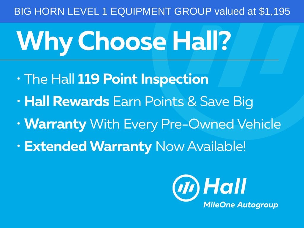 Bed Utility Group (DISC) (LED Bed Lighting, MOPAR Deployable Bed Step, and MOPAR Spray In Bedliner), Big Horn Level 1 Equipment Group (2 Way Rear Headrest Seat, 2nd Row In Floor Storage Bins, 4 Way Front Headrests, 40/20/40 Split Bench Seat, Auto Power-Folding Mirrors, Auto-Dimming Rear-View Mirror, Black Exterior Mirrors, Cloth 40/20/40 Premium Bench Seat, Dual Glove Boxes, Exterior Mirrors Courtesy Lamps, Exterior Mirrors w/Heating Element, Exterior Mirrors w/Supplemental Signals, Foam Bottle Insert (Door Trim Panel), Folding Flat Load Floor Storage, Footwell Courtesy Lamp, Forward & Reverse Utility Lights, Front Armrest w/Cupholders, Front Center Seat Cushion Storage, Front Seat Back Map Pockets, Glove Box Lamp, Locking Lower Glove Box, Luxury Steering Wheel, Manual Adjust 4-Way Front Passenger Seat, Mirror Running Lights, Power 2-Way Driver Lumbar Adjust, Power Adjust 8-Way Driver Seat, Power Adjust Mirrors, Power Heated Fold Telescopic Mirrors, Power Telescoping Mirrors, Power-Adjustable Convex Aux Mirrors, Rear 60/40 Folding Seat, Rear Dome w/On/Off Switch Lamp, Remote USB Port - Charge Only, Steering Wheel Mounted Audio Controls, and Storage Tray), Quick Order Package 24Z Big Horn, 4-Wheel Disc Brakes, 4G LTE Wi-Fi Hot Spot, 6 Speakers, ABS brakes, Air Conditioning, Alloy wheels, AM/FM radio: SiriusXM, Apple CarPlay, Apple CarPlay/Android Auto, Brake assist, Bumpers: chrome, Cloth 40/20/40 Bench Seat, Compass, Connectivity - US/Canada, Delay-off headlights, Driver door bin, Dual front impact airbags, Dual front side impact airbags, Electronic Stability Control, Front anti-roll bar, Front Center Armrest w/Storage, Front fog lights, Front License Plate Bracket, Front reading lights, Fully automatic headlights, Global Telematics Box Module (TBM), Google Android Auto, GPS Antenna Input, Heated door mirrors, Illuminated entry, Integrated Voice Command w/Bluetooth, Low tire pressure warning, Manual Adjust 4-Way Driver Seat, MOPAR Front & Rear Rubber Floor Mats, Occupant sensing airbag, Outside temperature display, Overhead airbag, Overhead console, Panic alarm, ParkView Rear Back-Up Camera, Passenger door bin, Passenger vanity mirror, Power door mirrors, Power steering, Power windows, Radio data system, Radio: Uconnect 5 w/8.4" Display, Rear Folding Seat, Rear seat center armrest, Rear step bumper, Rear window defroster, Remote keyless entry, Remote Start System, Selectable Tire Fill Alert, SiriusXM Radio Service, Speed control, Tachometer, Tilt steering wheel, Traction control, Trip computer, Turn signal indicator mirrors, Variably intermittent wipers, Voltmeter, and Wheels: 18" x 8.0" Polished Aluminum.